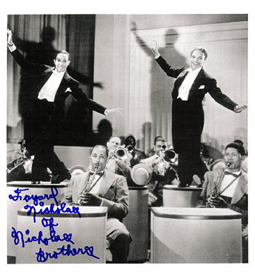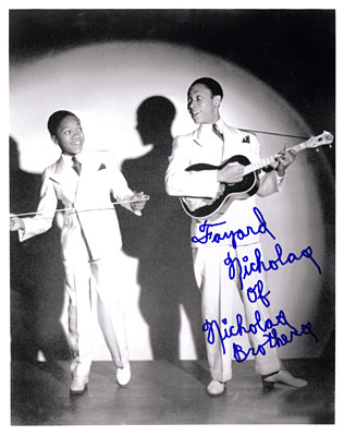 The Nicholas brothers talent was discovered early by the Lafayette Vaudeville showcase and from the Lafayette they opened at the Cotton Club in 1932. They worked at the Cotton Club for two years with famous performers such as Duke Ellington, Ethel Waters and The Stepping Brothers. In 1934 they went to Hollywood to star in Kid Millions. In 1936 the brothers traveled out of the country for the first time to Europe to play in the movie Blackbirds starring Josephine Baker, Bob Hope and Eve Arden. After performing in the Broadway debut in 1936, Ziegfeld Follies, George Balancine put them into the original Rodgers and Hart's Babes in Arms in 1937. The Nicholas Brothers have made over thirty films, of which they themselves consider Stormy Weather (1943), their personal favorite. In Stormy Weather the brothers climb several stairs by jumping and landing in the splits and tap dancing in between.The Nicholas Brother were most famous for their open splits and coming right back up in the dance routine. |