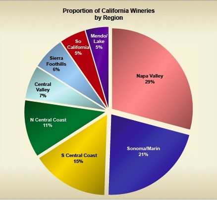 To place these figures into a larger context, we have provided a pie chart showing where the 3200+ wineries in our database were located. As can be seen from the pie chart, the percentage of wineries in the wine regions we used ranged from approximately 5% to 30%, with Napa having the highest percentage, and Southern California and Mendocino/Lake Counties having the lowest. About half of the state's wineries in our database were located in Napa Valley and Sonoma/Marin. (Please click on the California map on the home page for definitions of the wine regions used in the study.)